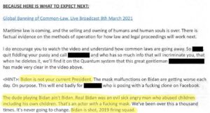 バイデンは私たちの現在の大統領ではない。バイデンのマスクは日に日に悪くなっている…バイデンを演じているやつはバイデンじゃない。本物のバイデンは子供を含む他の人に性的暴行を加えた嫌悪な男だった。バイデンは2019年に射殺された