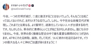 また、この投稿の中に「完全で徹底的な政権交代が実現する」とも書いています。これはイランの政権を指しているのか?確かにそうではあります。ですが、この政権交代はイランだけではないかと思われます。